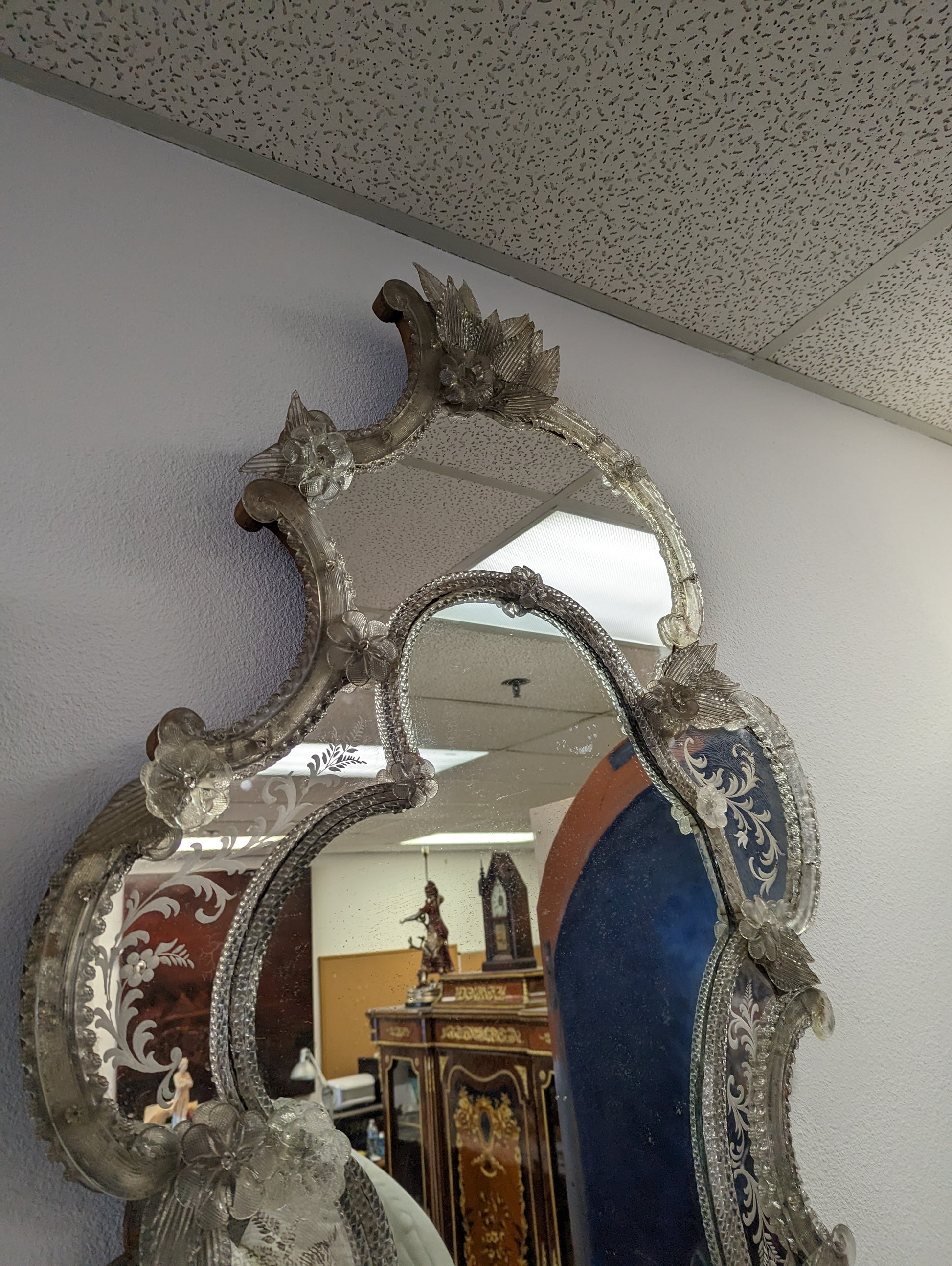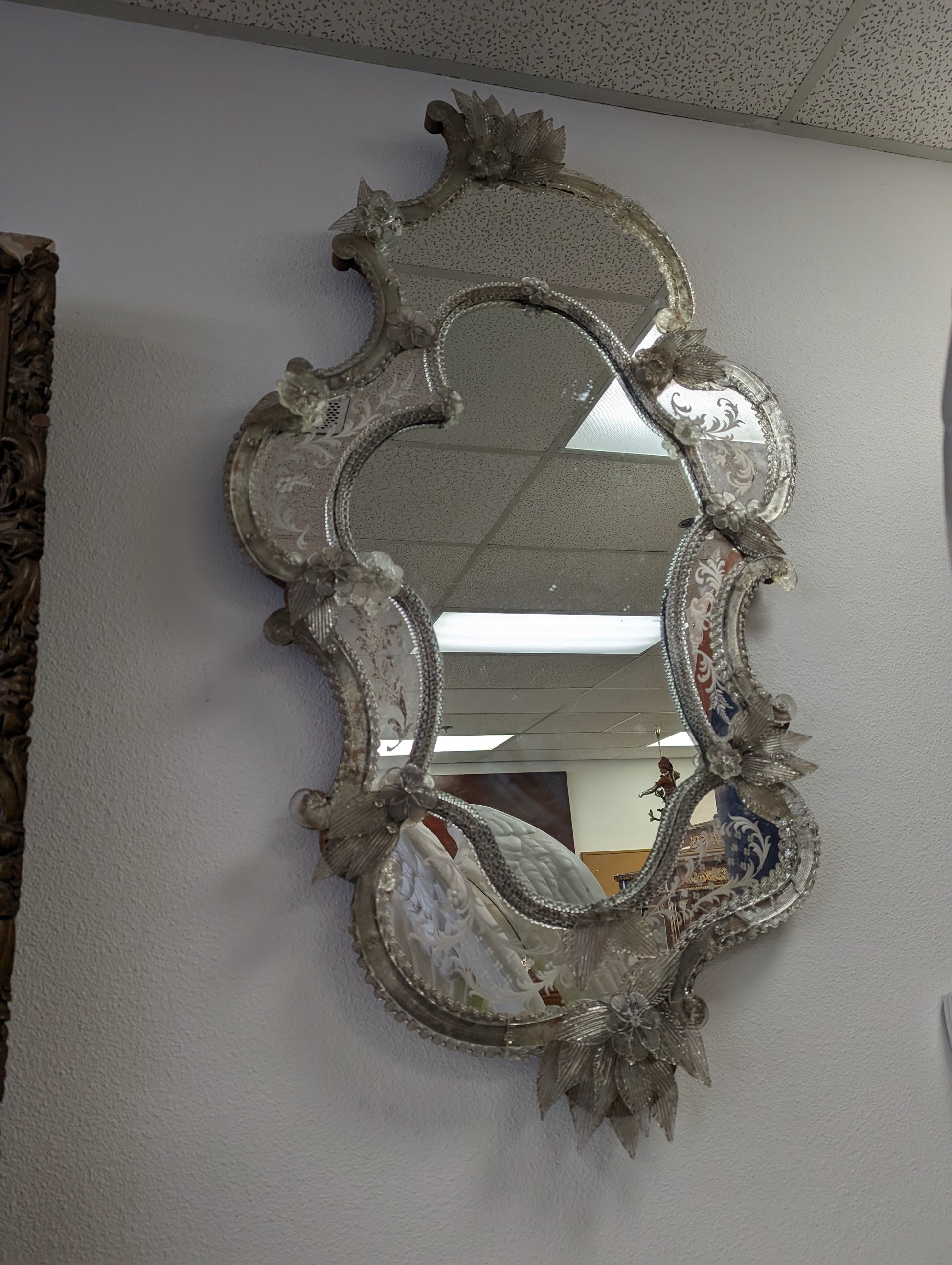Beautifully hand crafted glass mirror with ornate cast decorations. Delicately assembled and lightly restored.