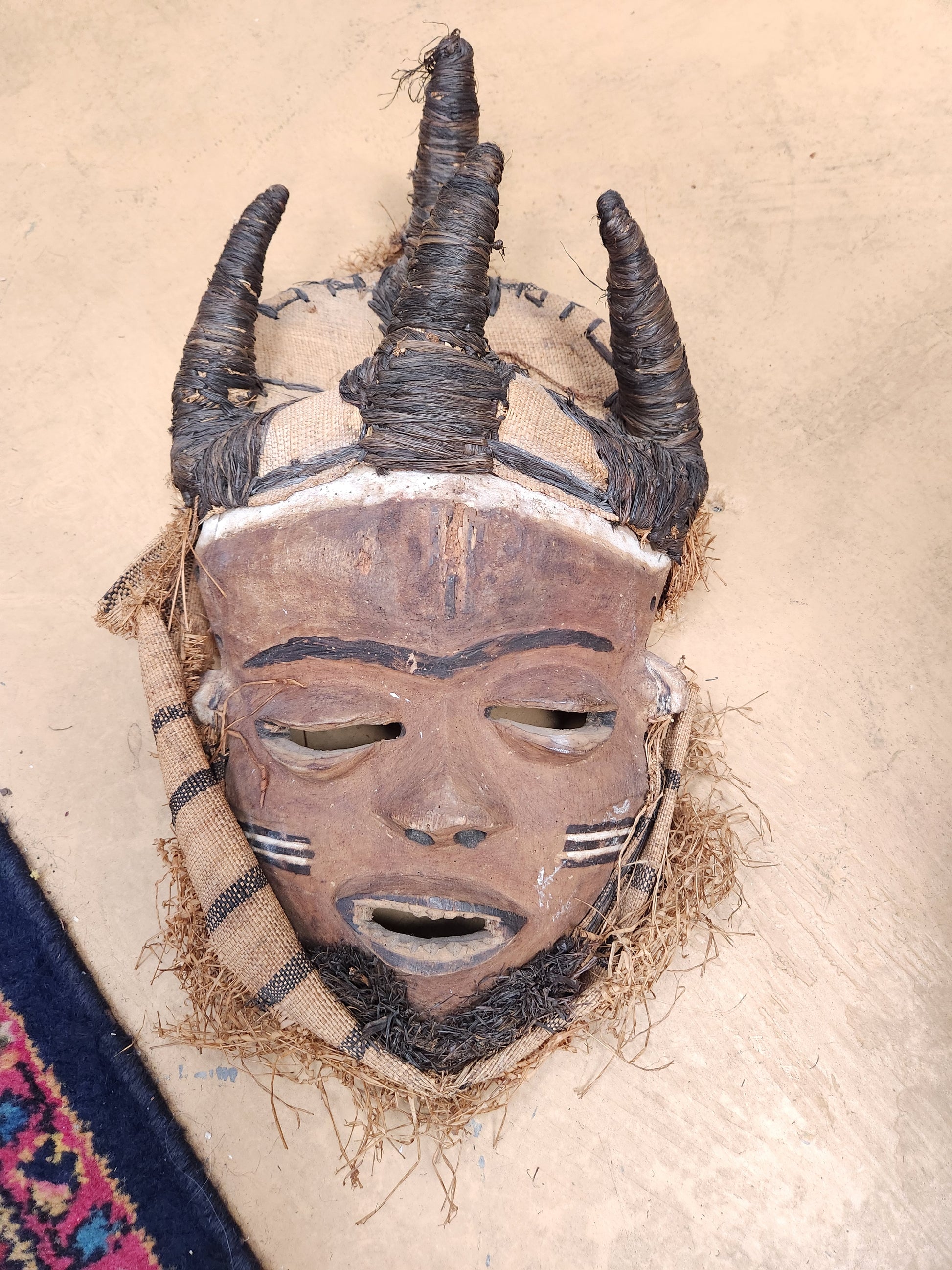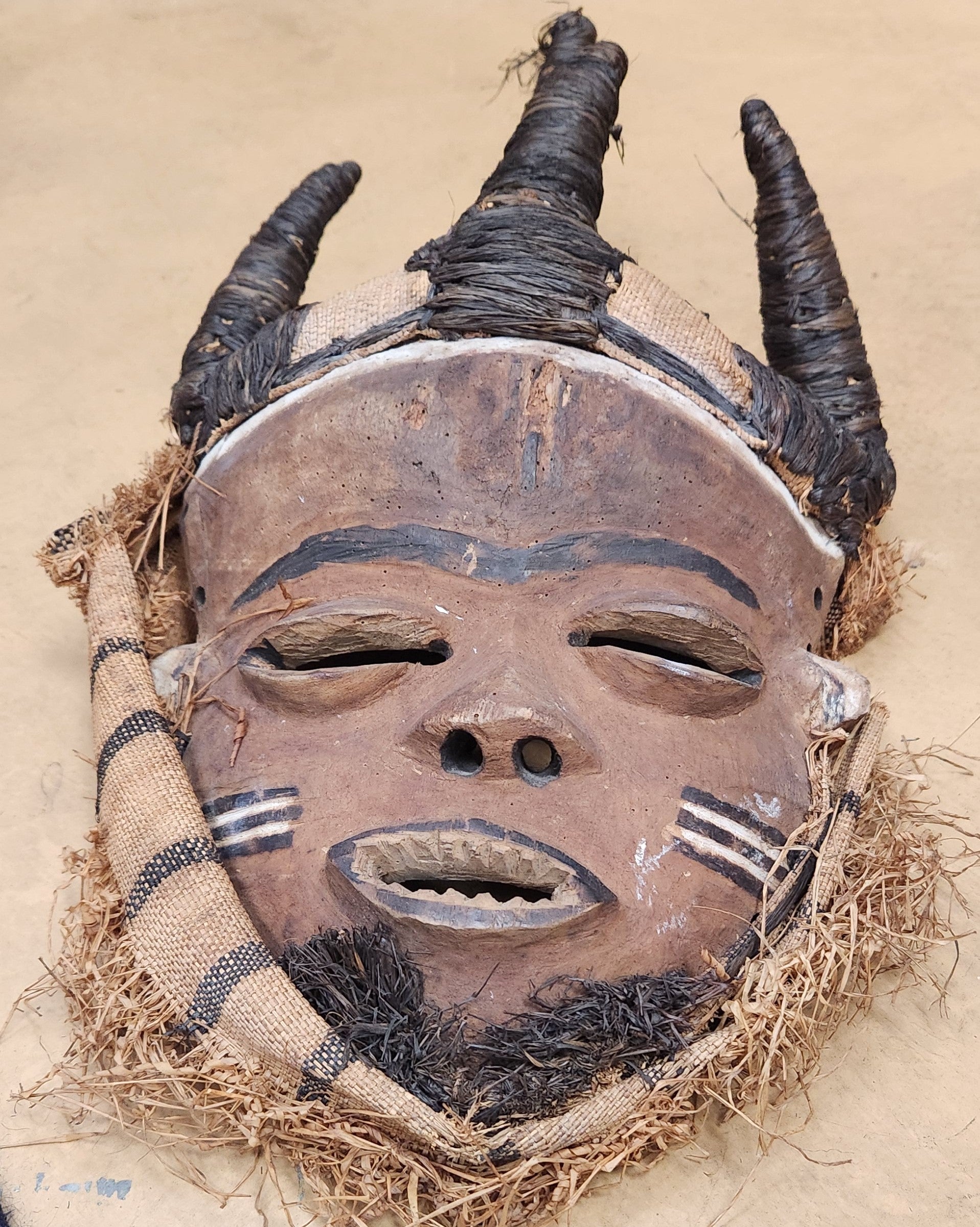 This mask was made by the Chokwe ethnic group who reside in the South-Western Democratic Republic of Congo (DRC). It was worn during initiation of young men into adulthood. The mask is framed by cloth made by raffia fibers and the top of the head is covered with raffia cloth from which four prongs emerge, each wrapped tightly with blackened cord. A close cropped black beard decorates the chin.