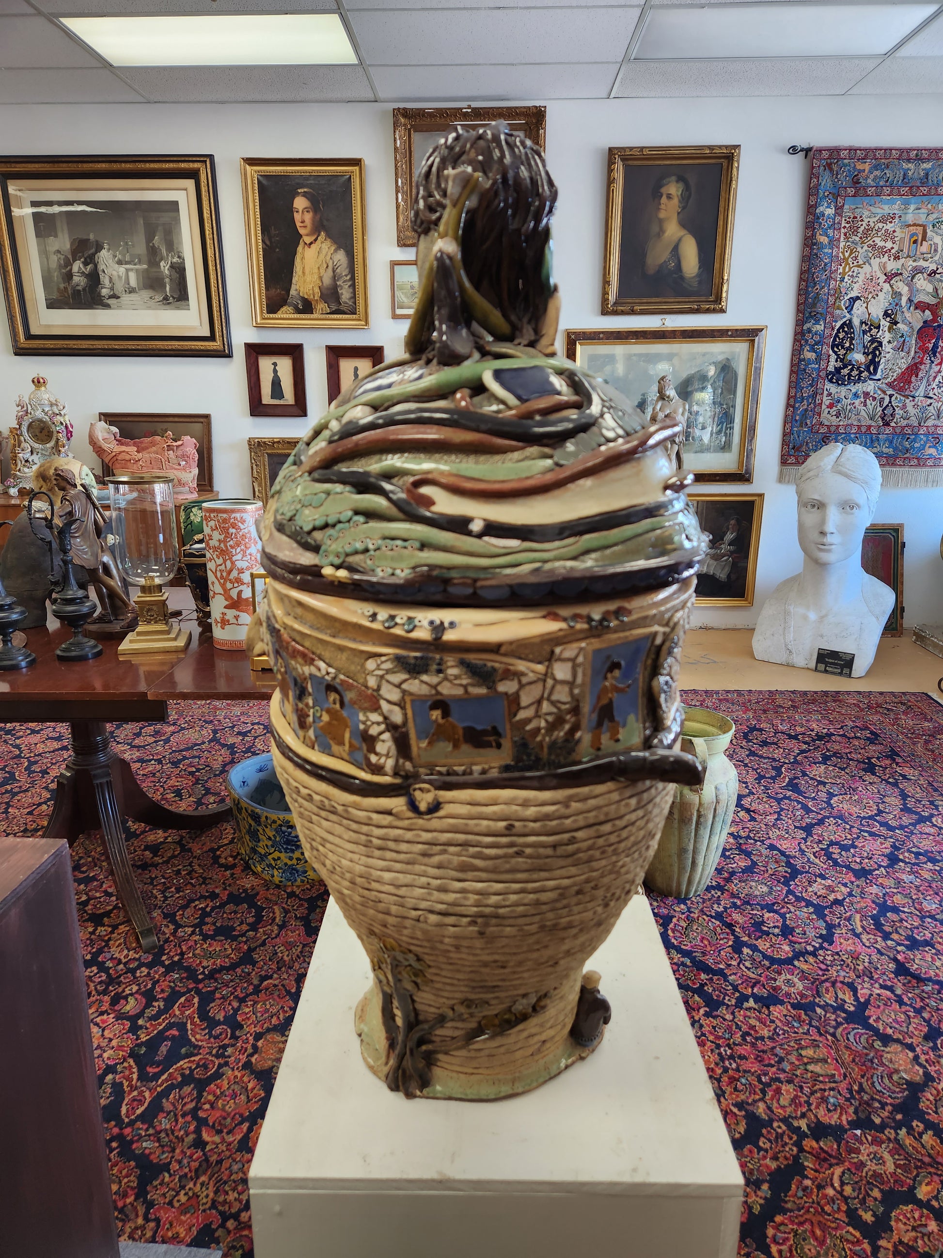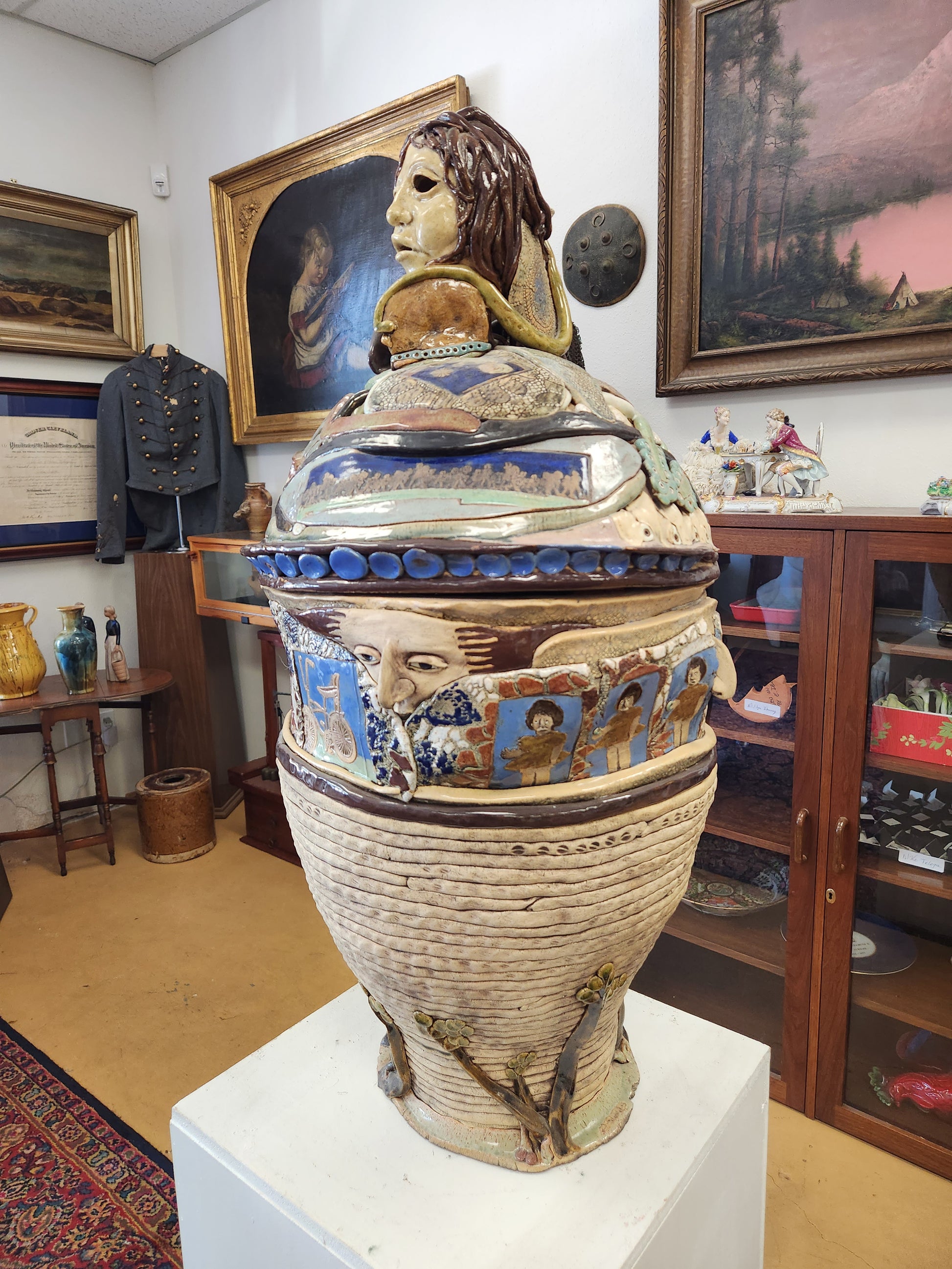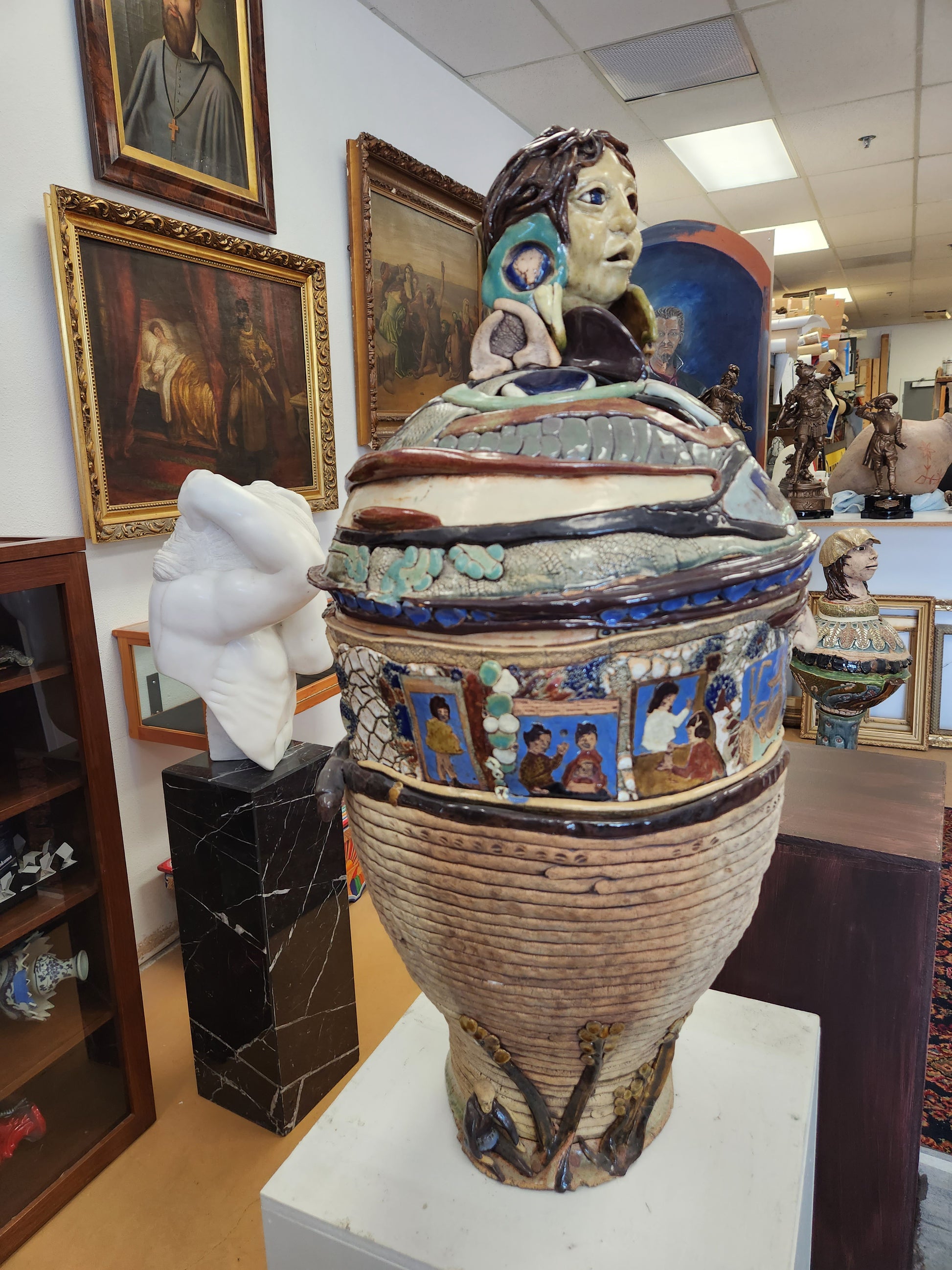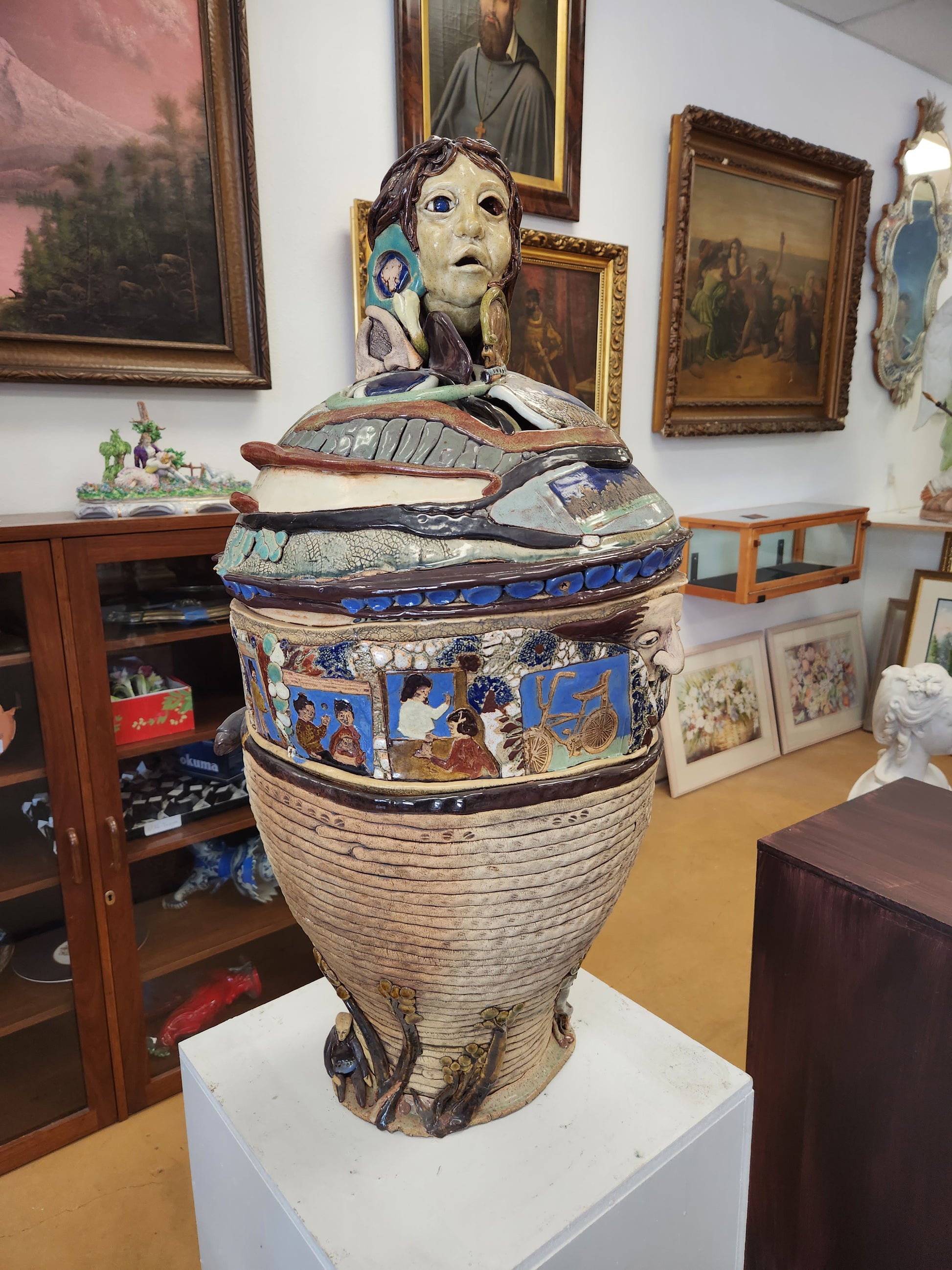 Incredible large ceramic creation by famed ceramic artist Ben Sams. One-Eyed Jane is a three part assembly in true Sams style, completed in 1972. Finished height is 38".