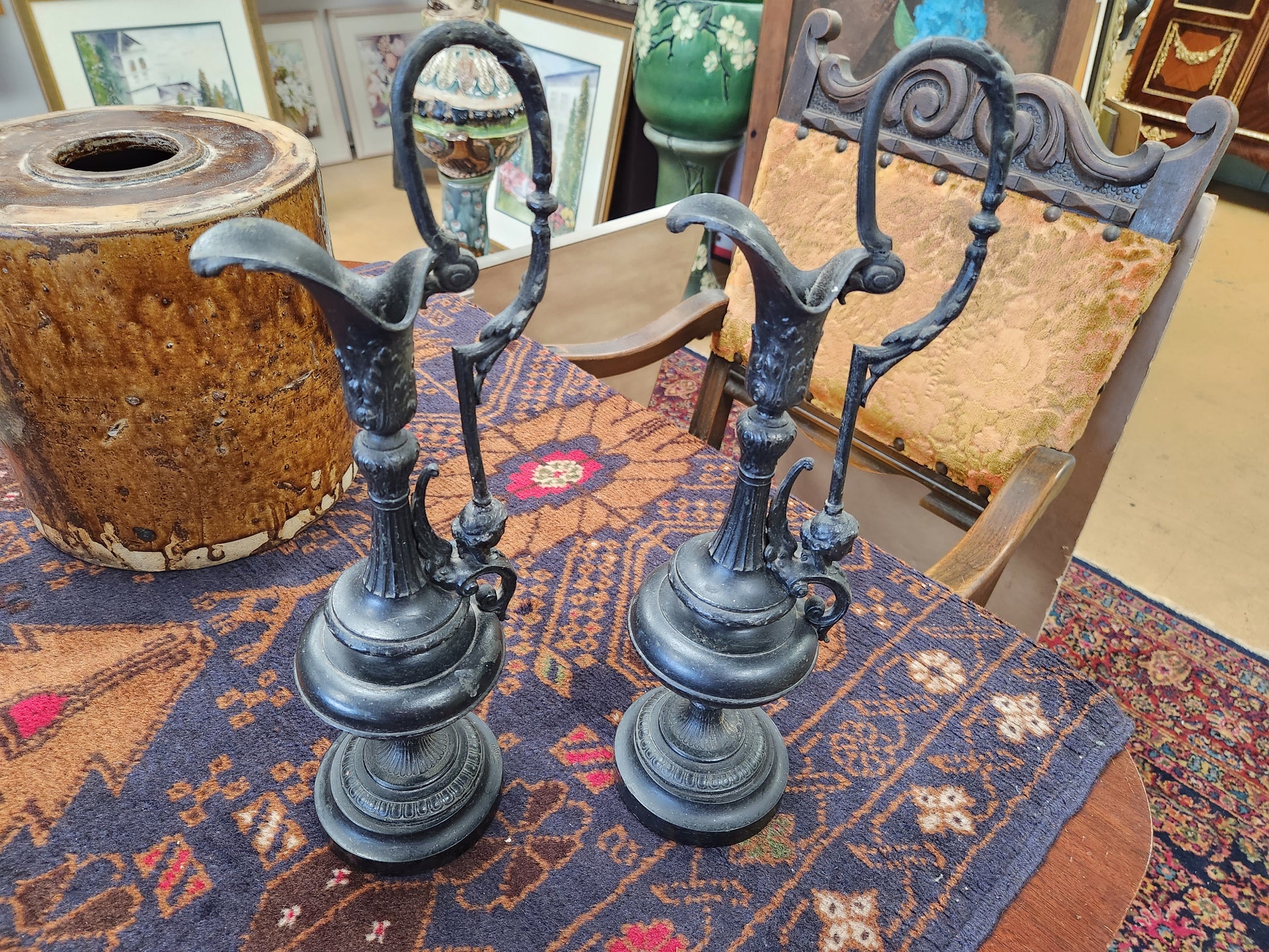 Beautiful Victorian Era spelter candle holder ewers with original black patina. 16 1/2" tall...sold as a set.