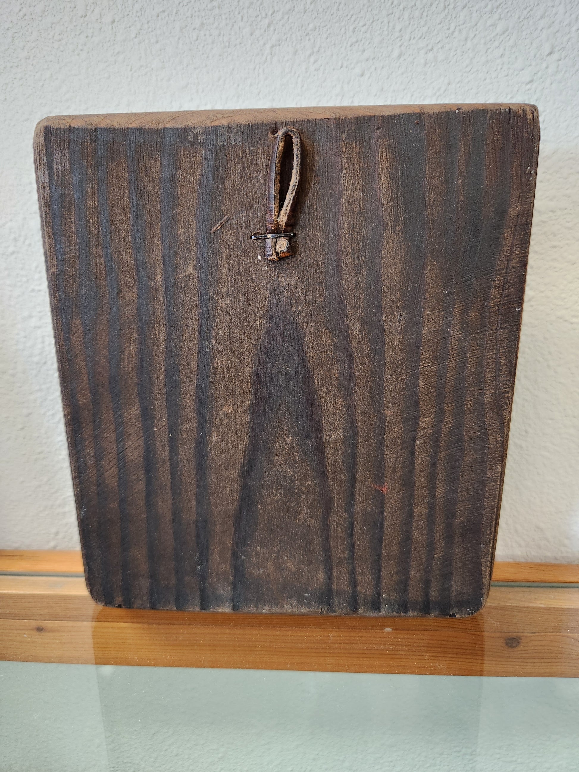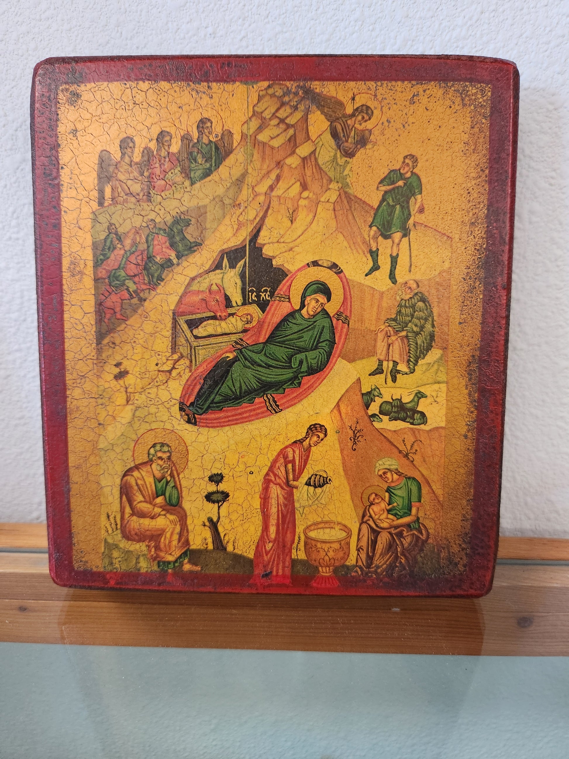 Nativity Scene, very unique image of the birth of Christ with red border on wood panel, Serigraph 5-9/16 x 6-3/8" tall