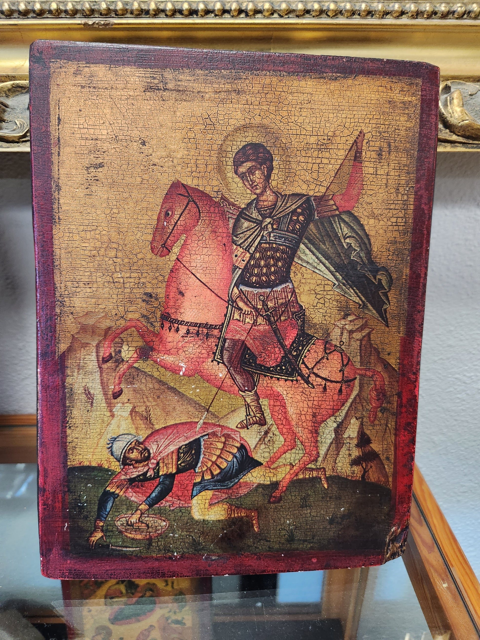St. George and the Dragon Icon early 20th C. replica serigraph on wood panel 8-1/4" x 11" perhaps St. George of Ipari