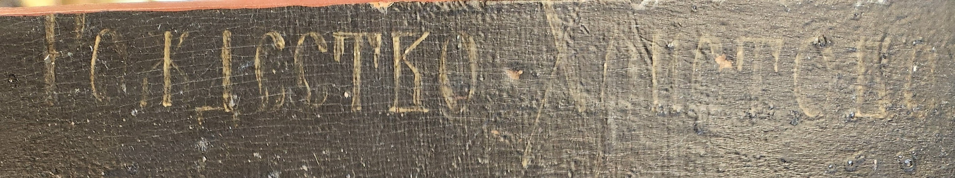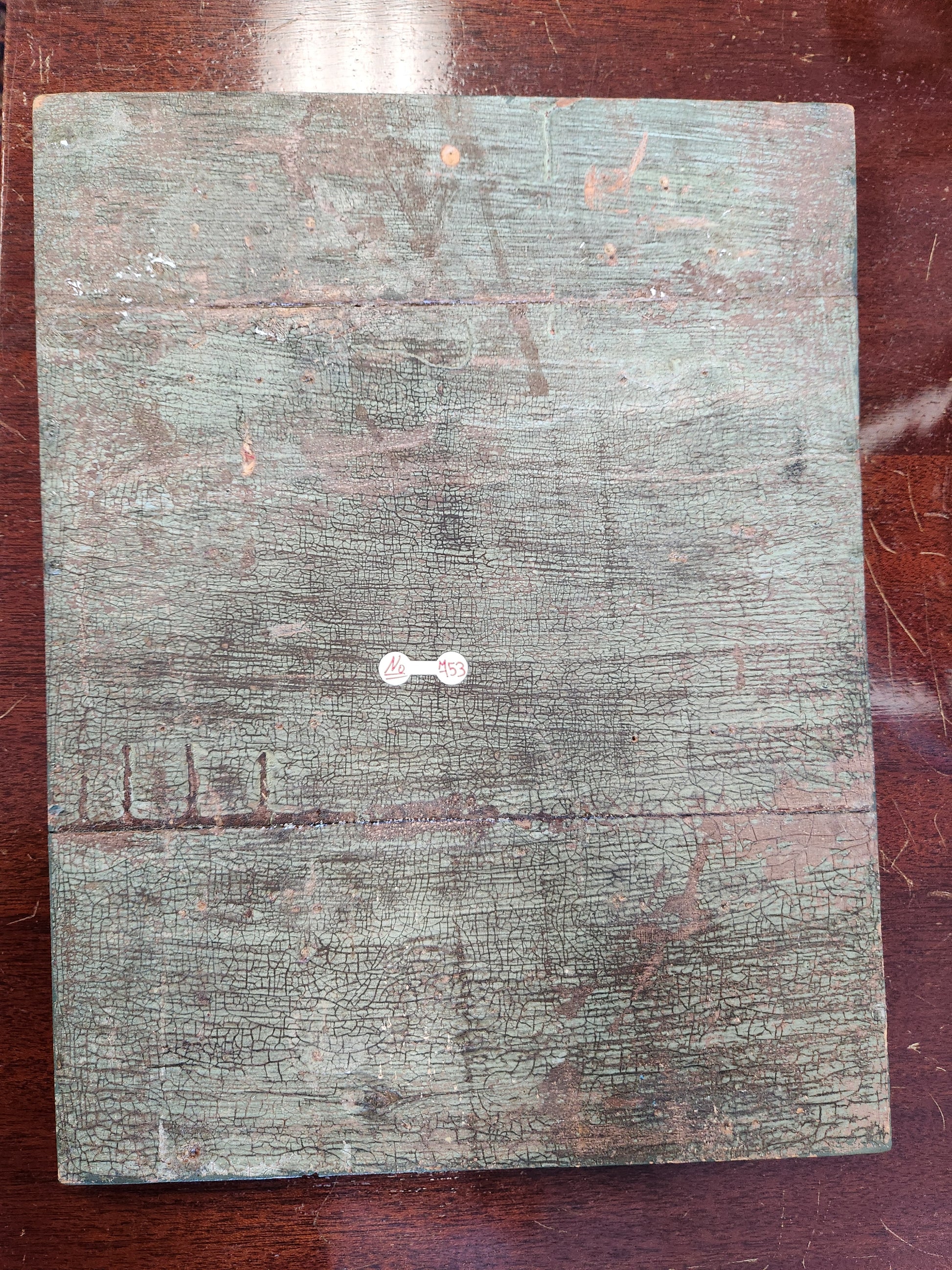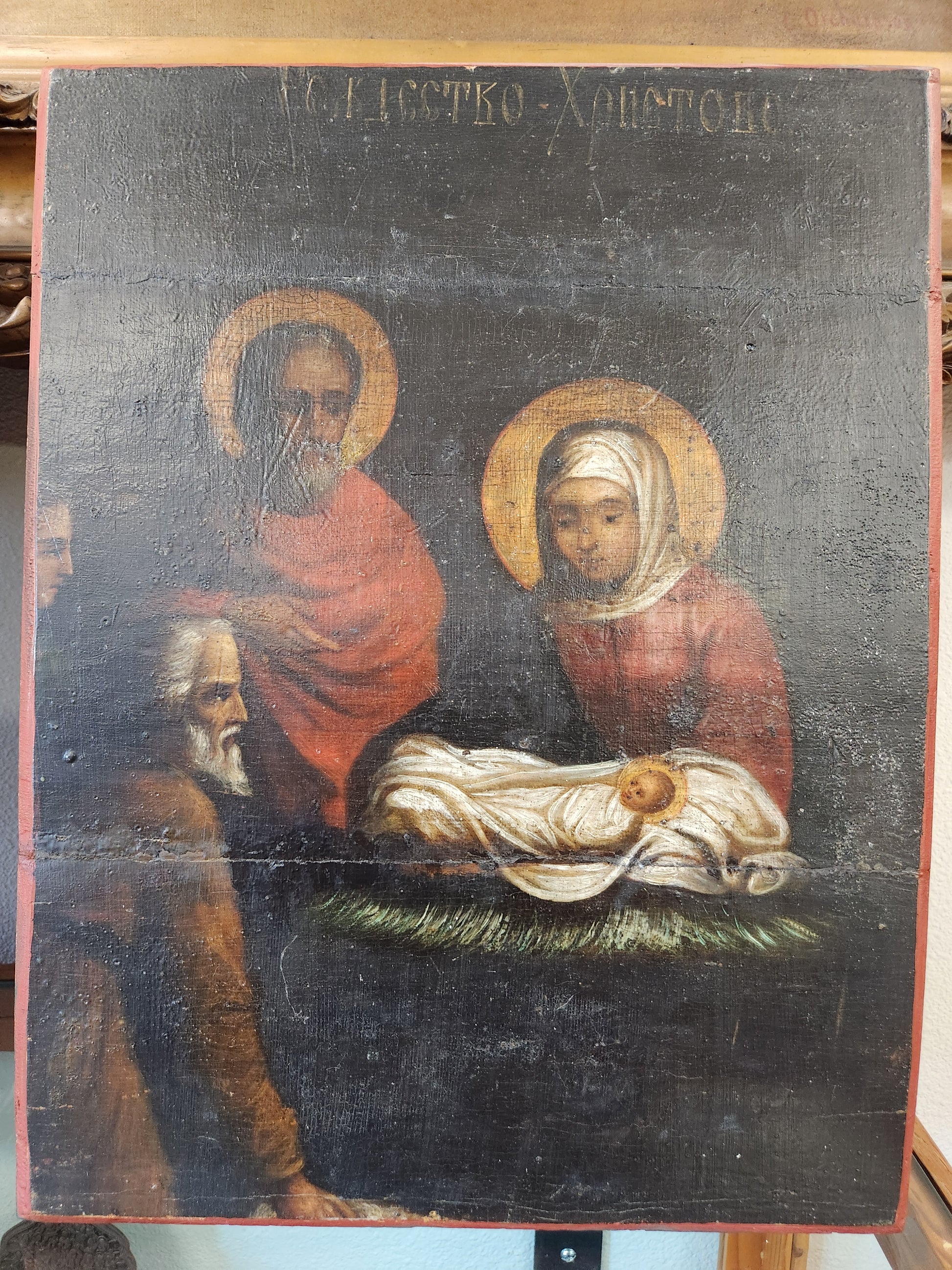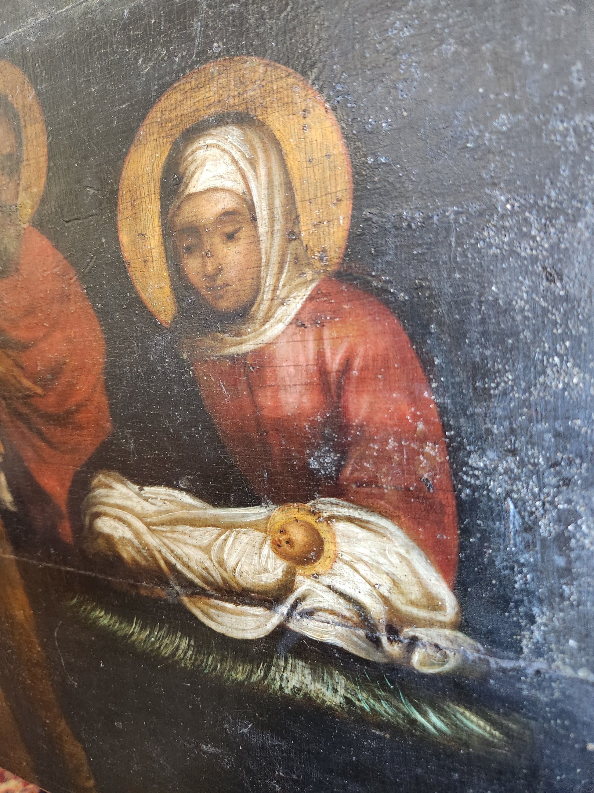 Paint on Board. Jesus in manger with holy St Mary and St Joseph, and onlookers. Acquired in Bethlehem, shows age and some wear. Date unknown. Fine devotional piece.
