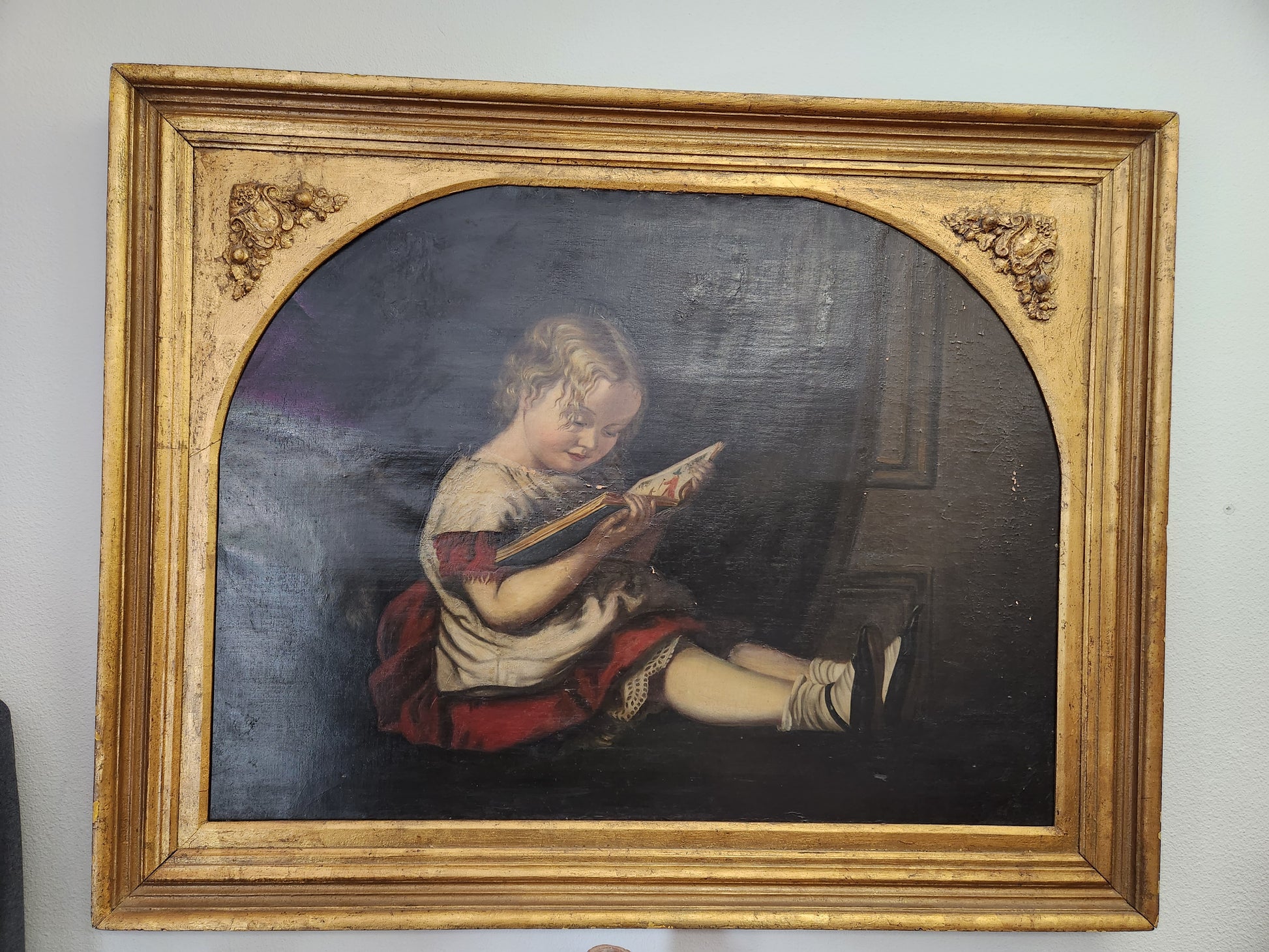 Magical oil painting on canvas in a unique period gilt frame. The young girl is in a bedroom sitting on the floor reading a book of fairy tails. Minimal restoration on this piece includes minor flakes, cleaning and touch up. 38" x 48". Great classical European fine oil painting to set the standard for your collection