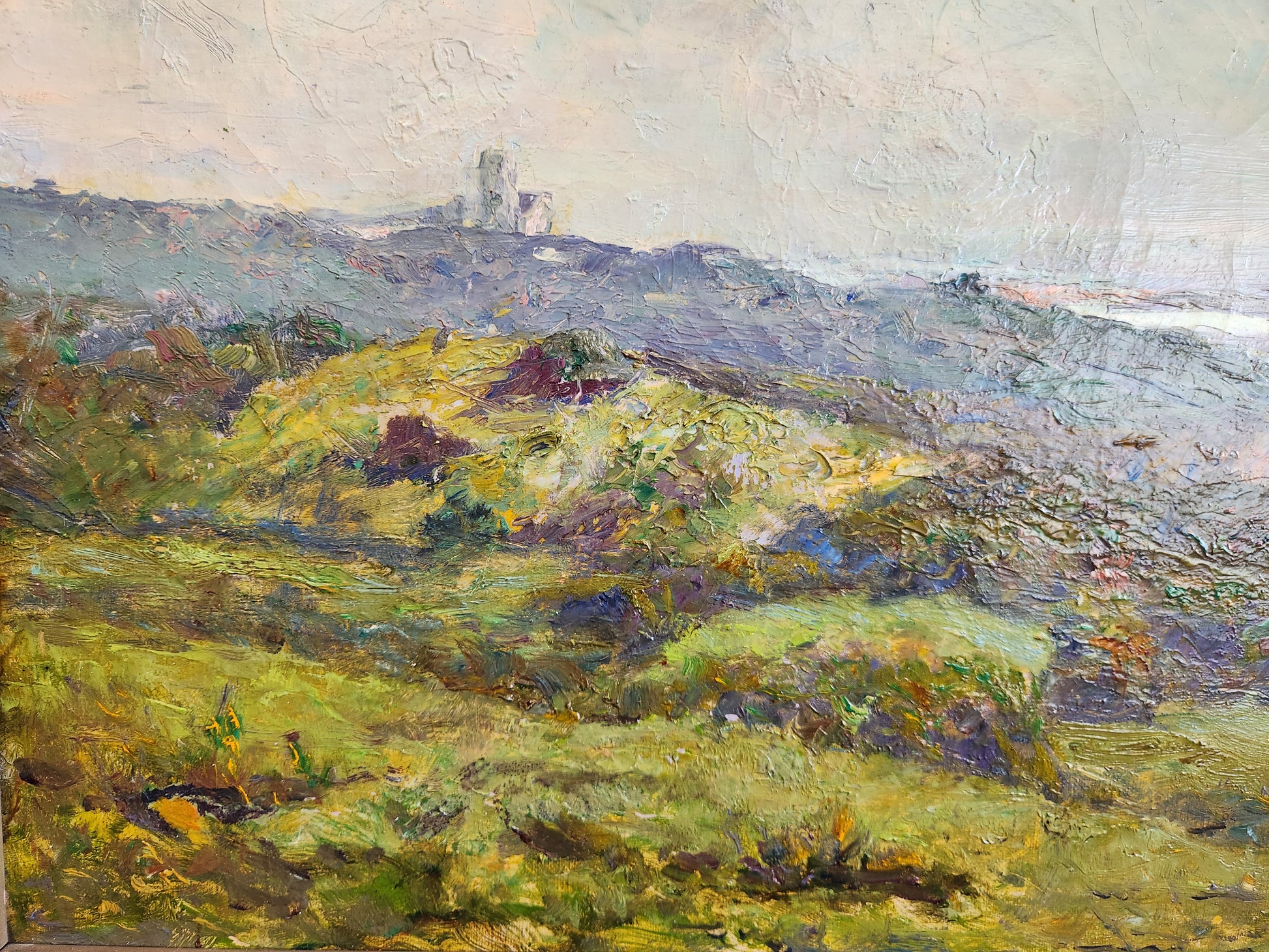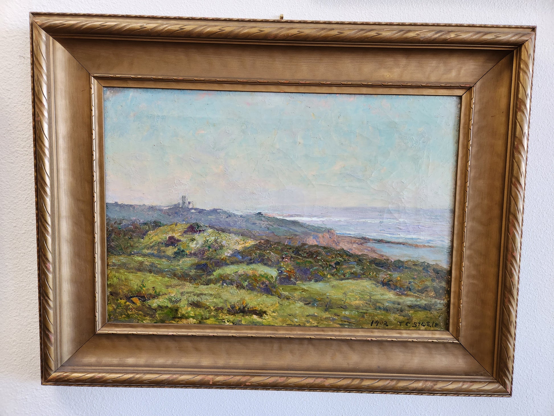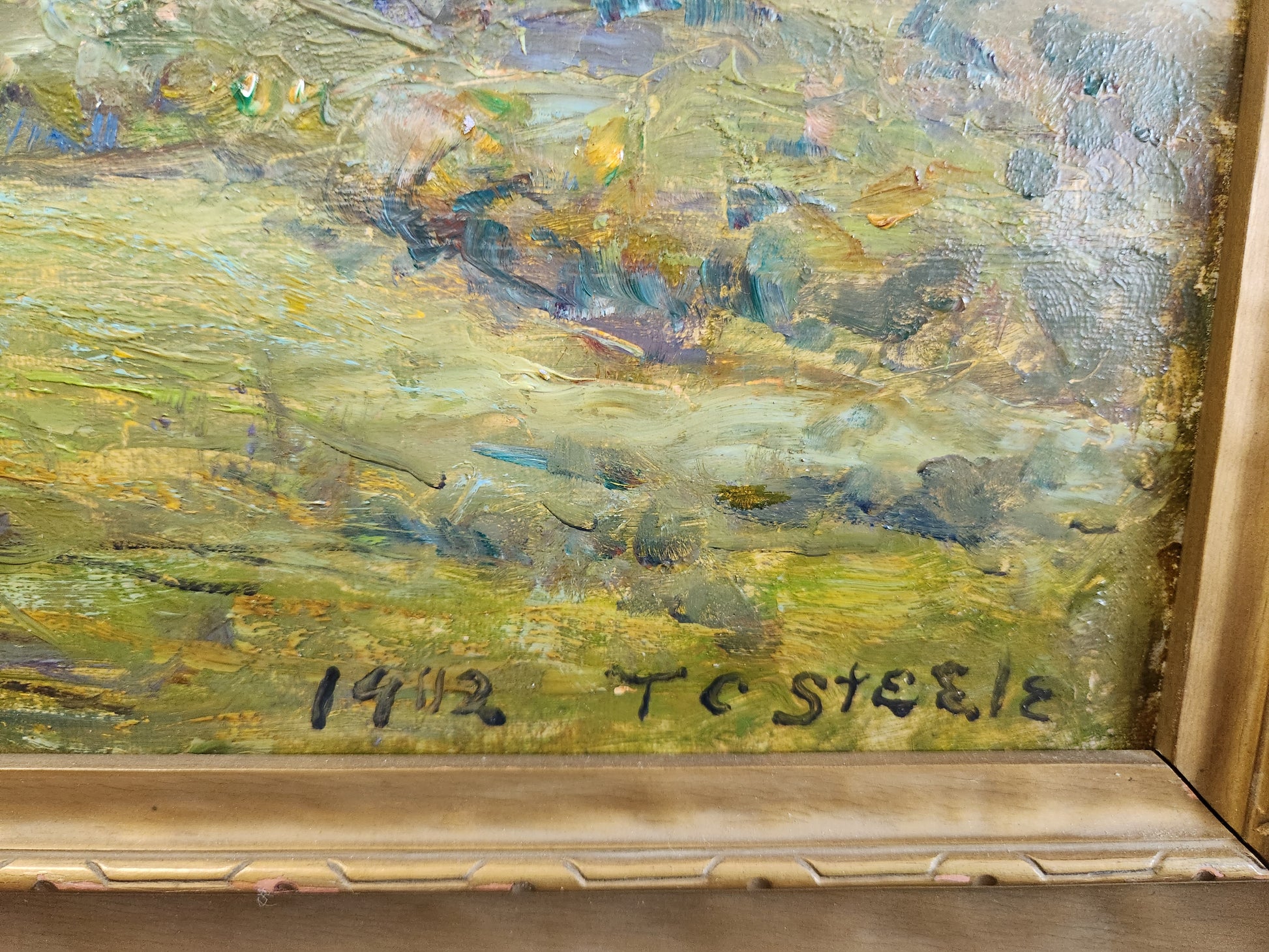 The famous Indiana Artist Theodore Clement Steel came to Astoria Oregon in 1902 and this is one of the paintings he made on that trip. This is a beautiful seascape with sensitive treatment of the sky and the sea. Very rare piece. Signed and dated 1902. Painting is 15" x 22" dimensions of frame 23" x 30"